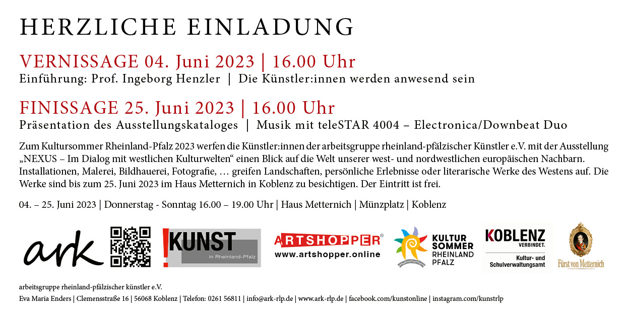 Die arbeitsgruppe rheinland-pfälzischer Künstler e.V. hat zu diesem Anlass 26 Künstler:innen zu einer Kunst-Ausstellung im Koblenzer Haus Metternich am Münzplatz eingeladen. Unter dem Titel „NEXUS- Im Dialog mit westlichen Kulturwelten“ ist ab dem 04. Juni bis zum 25. Juni 2023 eine Exposition zu sehen, die vielfältiger nicht sein könnte. Das Wort NEXUS im Titel bedeutet Verbindung, Verkettung und Zusammenhang. Die ausgestellten Werke beziehen sich nicht nur auf die eigenwilligen Landschaftstypen der westlichen Länder, sondern auch auf Schriftsteller:innen, Politik und Gesellschaft, oder auf sehr persönliche Erfahrungen. Entstanden sind ausdrucksstarke Werke, zu sehen als Malerei, Fotografie oder Installation.